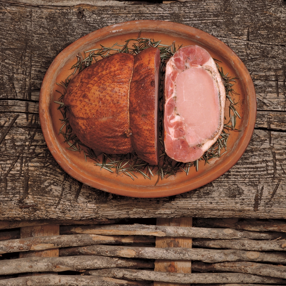 Oca intera disossata, farcita con filetto di maiale previamente salato, cucita a mano, legata, cotta in forno e quindi sottoposta a leggera affumicatura.
