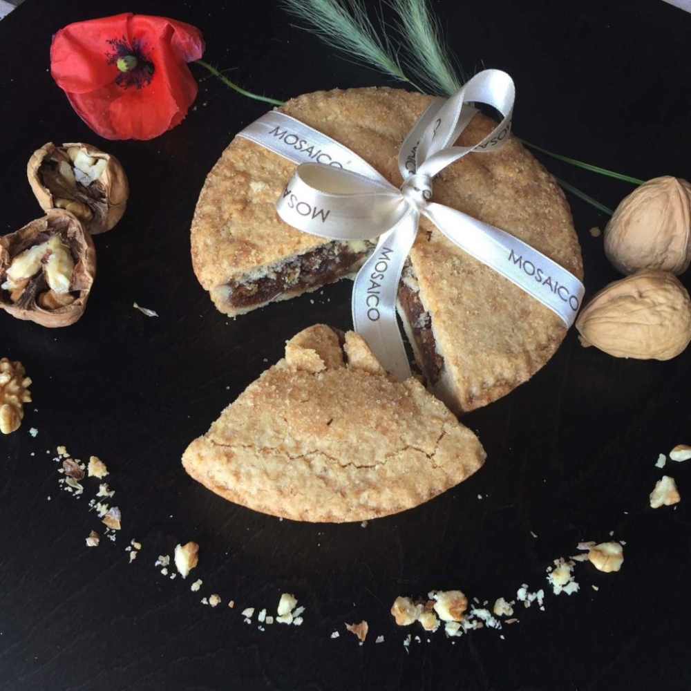Nasce con l’idea di utilizzare gli ingredienti che erano già usati nell’antichità per realizzare i dolci e vi troviamo all’interno le noci, il farro, i fichi e il miele.